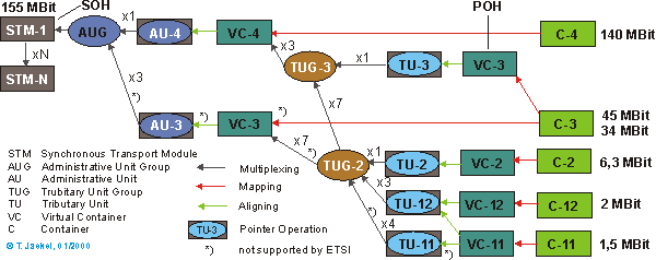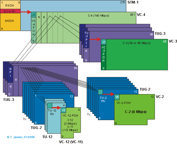 Werden mehere solcher VC gemeinsam in der Payload uebertragen, werden diese in sogenannte Tributary Unit Groups (TUG) verpackt. Dabei erfolgt ein byteweises Multiplexen der einzelnen Bytes.