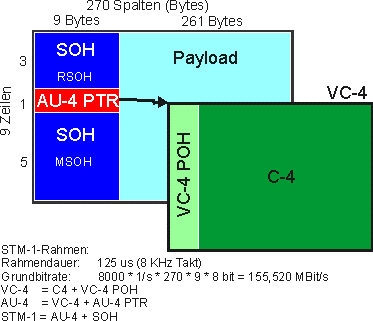 Sind Wartezeiten notwendig (geringere Bitrate des einzuschachtelnden Signals) wird der Pointer korrigiert und der Container wird etwas im Rahmen verzoegert. Dieser Container beginnt immer in einem Rahmen und endet im nachfolgenden. Innerhalb des Rahmens ist er frei beweglich und wird ueber den AU4-Pointer markiert. Bei geringeren Zugangsbitraten erfolgt ein positives Stopfen, d.h. es werdem Fuellbytes eingefuegt und der Container-Anfang mit dem Pointer korrigiert.