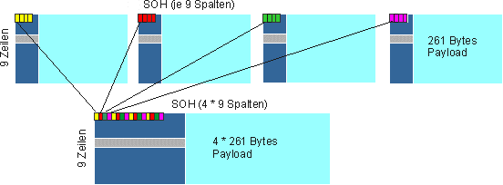 Anschliessend werden die SOH-Bytes ergaenzt und der SDH-Rahmen ist komplett. Durch das definierte und vereinfachte Multiplex-Schema, die Kennzeichnung der enthaltenen Container-Typen bei der Uebertragung und das byteweise Multiplexen bei netzsynchronen Takten kann beim Empfang sehr einfach ein beliebiges Nutzsignal extrahiert (Drop-Funktion) oder hinzugefuegt (Add-Funktion) werden.